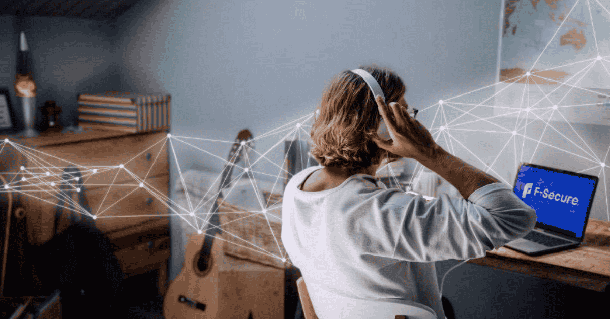 Henkilö työskentelee kotitoimistossa ja käyttää F‑Secure‑suojattua kannettavaa laitetta turvalliseen verkkoyhteyteen.